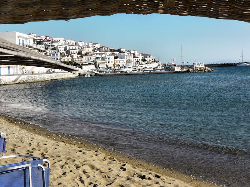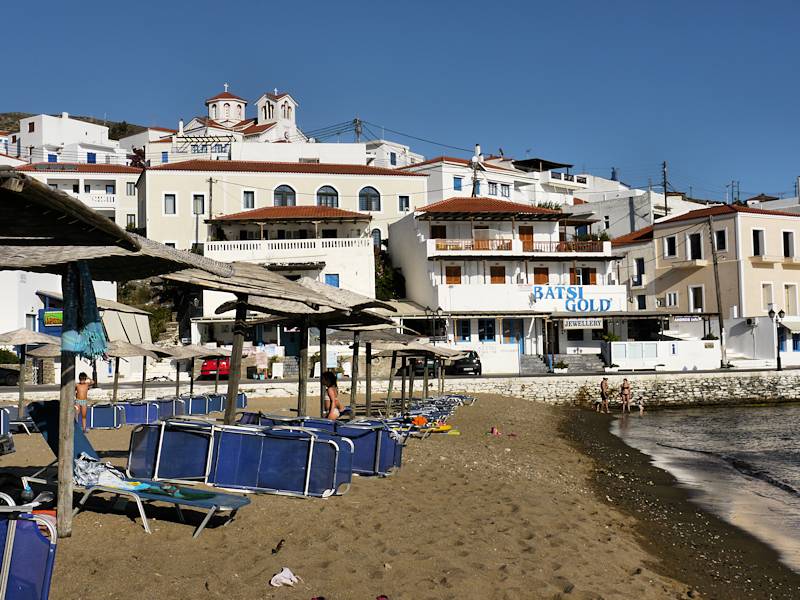Batsi s'étend sur une petite colline qui fait face à la mer Égée. L'endroit est charmant même si quelques immeubles modernes ne sont pas du plus belle effet. Le village est paraît-il touristique mais nous n'avons pas constaté une affluence importante alors que la saison bat son plein. Sur place, il y a tout ce qu'il faut pour passer un agréable séjour : une belle plage, des restaurants et des commerces.