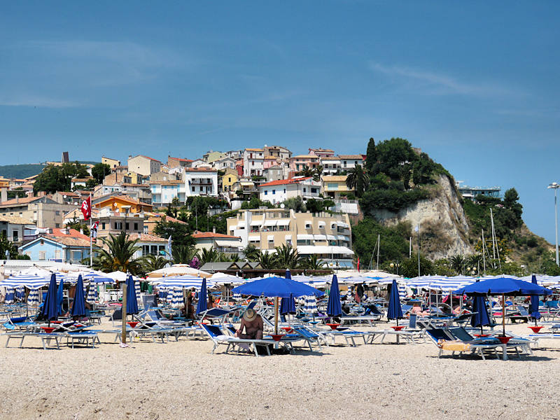 Numana, c'est la grande plage au sud d'Ancône. Le village, perché sur une colline, domine la mer et une longue plage en arc de cercle s'étend au loin.