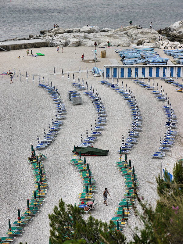 Les transats et les parasols sont là, alignés proprement « à l'italienne » ! Il faut d'ailleurs reconnaître que les Italiens ont un véritable talent pour la mise en scène de l'espace marin. Les couleurs et les géométries sont savamment réfléchis et l'harmonie est toujours au rendez-vous. Chapeau ! On en oublierait presque qu'ils ont une fâcheuse tendance à privatiser des pans entiers de l'espace publique. C'est un peu Saint-Trop sur toute la côte...