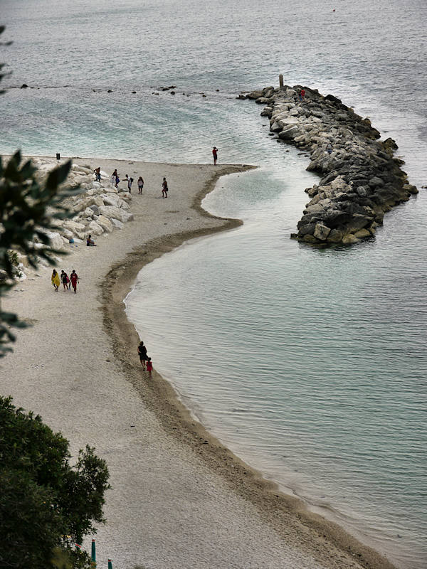 À quelques km au nord de Numana, se trouve la plage de Sirolo. Située au pied d'une falaise de calcaire abrupte, cette petite plage est très belle avec sa jetée et ses parasols, là encore, très joliment agencées. Curieusement en cette fin d'après-midi, la plage est déserte, les parasols sont déjà pliés et les touristes sont partis. Reste que Sirolo est incontestablement un bel endroit pour se prélasser et profiter des joies de l'été...